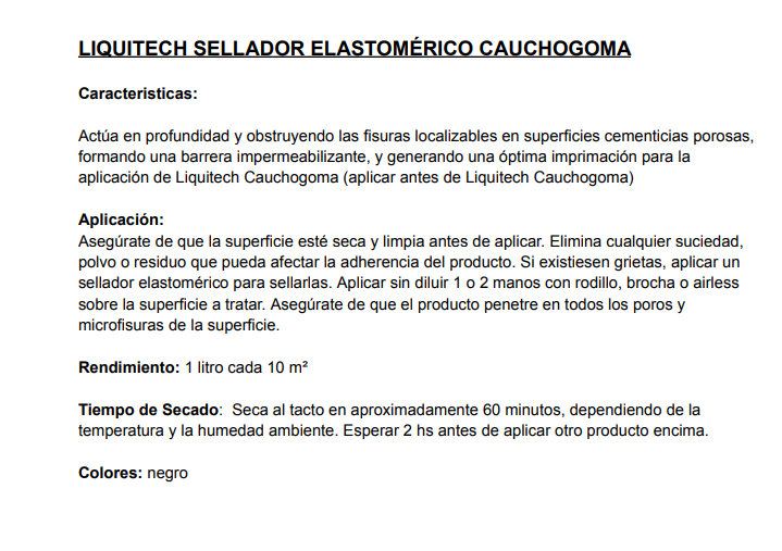 Usos recomendados: Sobre cemento, Aplicar antes del liquitech caucho goma impermeabilizante